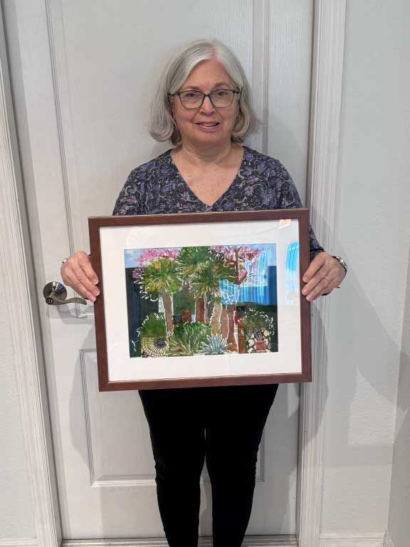 This is a picture of me holding “In the Palm Grove” , this is a mixed media picture. It is for sale at $500.