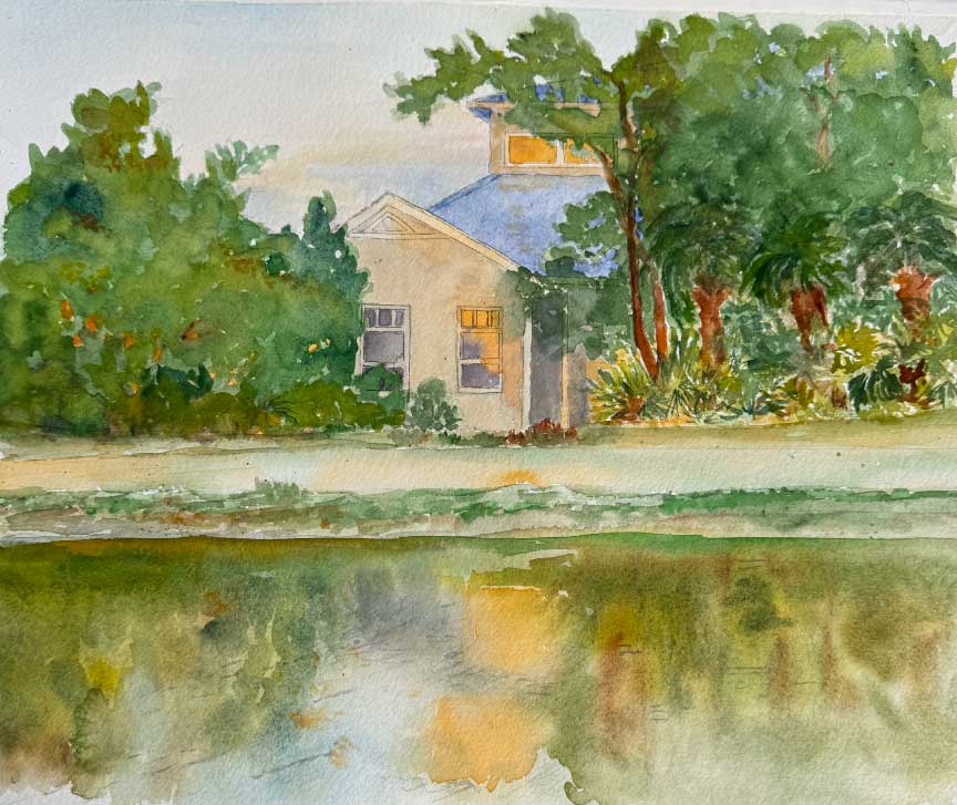 “Sunlight late Winter Afternoon”, is a watercolor inspired by the view behind my home. I was drawn to the warm orange light reflecting on the water. It was submitted to the Florida Watercolor Artists 2026 Associate Member Online Exhibition.