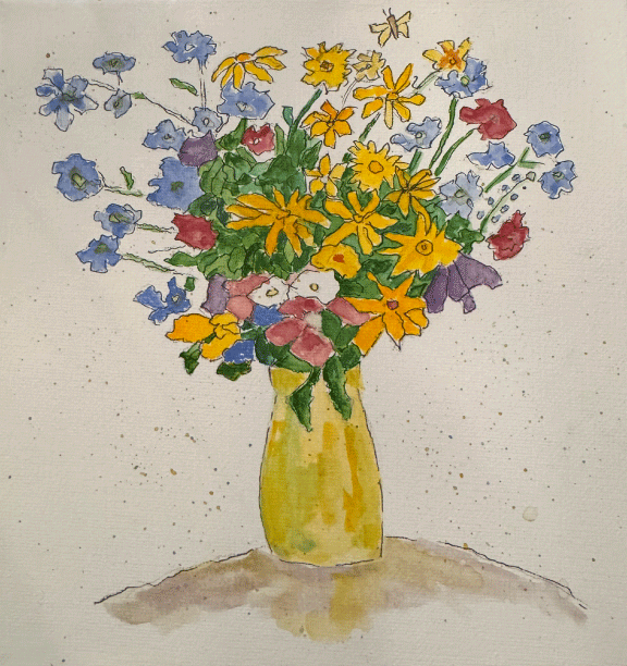 “Flowers in a Vase”, watercolor and gouache, on an 8″x8″ canvas for Hub’s November Fundraiser Exhibit