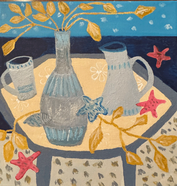 “Table by the Sea”, watercolor and gouache, on an 8″x8″ canvas for Hub’s November Fundraiser Exhibit.