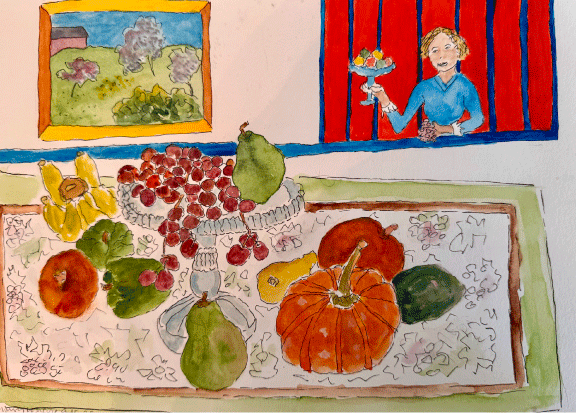 “Harvest Still Life” is from a class sketching exercise. I added some colorful details influenced by Matisee’s  colorful picture of “Harmony in Red”
