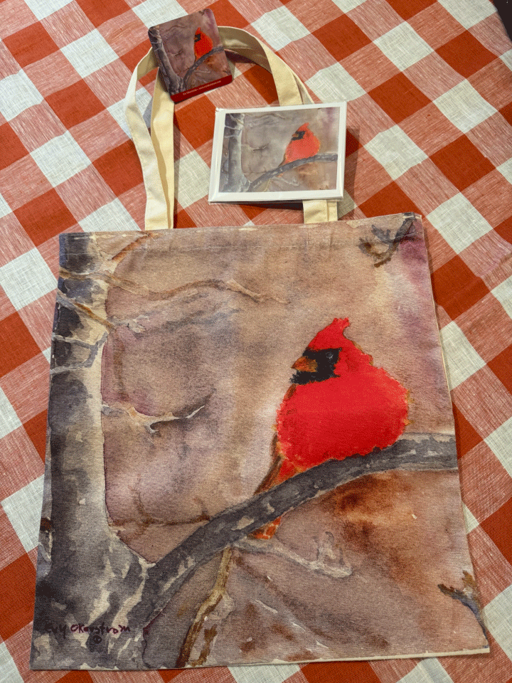 In December, I introduced “The Cardinal Collection”. Items can be used year round.  This included a 16”x15”canvas tote bag ($20) with a 3”x3” magnet ($5) and a note card ($5) with the Cardinal image. They are sold separately or as a set.  Let me know if you are interested in owning this Collection, as I have some of them still available.